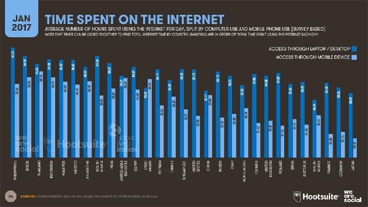 L’Italia detiene il primato europeo ● Media di 4. 01 ore al giorno passate in rete su un desktop/laptop ● Media di 2. 08 ore al giorno passate in rete su smartphones