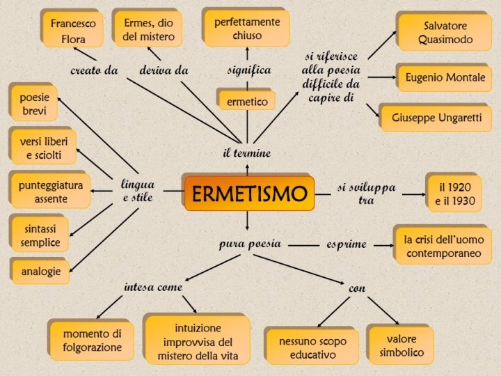 L’ERMETISMO Ø Non è una corrente letteraria ma un atteggiamento comune assunto da un gruppo di poeti. Ø Si afferma in Italia tra il 1920 e il 1930. Ø Il termine Ermetismo fu coniato dal critico Francesco Flora per indicare la difficile comprensione di queste poesie. Ø Ermetico significa perfettamente chiuso, il termine deriva dal dio delle scienze occulte Ermes o dal sapiente greco Ermete Trismegisto. Ø La poesia è concepita come una improvvisa intuizione del mistero della vita. Ø La poesia ermetica è una poesia pura ed essenziale, senza scopo educativo, caratterizzata da componimenti brevi, costituiti da poche parole con un intenso valore simbolico e un forte potere evocativo. Ø Rifiuta ogni formalismo esteriore, usa versi liberi e sciolti e una sintassi semplice, priva di nessi logici e di punteggiatura. Ø I temi trattati sono il senso di vuoto e la solitudine dell’uomo contemporaneo che vive in un’epoca travagliata da guerre e dittature.