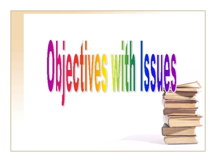 Problems False/missing behavior, condition, or degree Error Types The objective does not list the correct behavior, condition, and/or degree, or they are missing. Can you locate the problem in this objective? Affective Objective Given the opportunity to work in a team with several people of different ethnic backgrounds, the student will demonstrate a willingness to participate in positive nondiscriminatory interactions with all team members. Given the opportunity to work in a team with several people of different ethnic backgrounds, the student will demonstrate a willingness to participate in positive non-discriminatory interactions with all team members, as measured by a checklist utilized/completed by non-team members. Solutions Be more specific, make sure the behavior, condition, and degree is included.