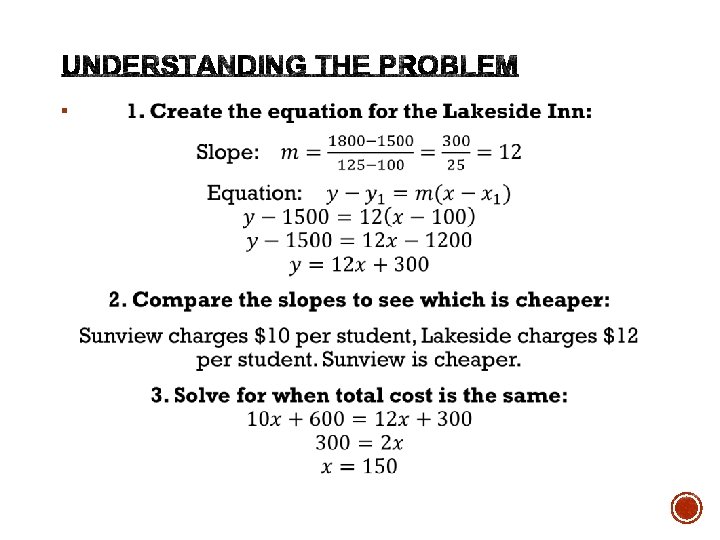 Two prom venues charge a rental fee plus a fee per student. The table shows the total costs for different numbers of students at Lakeside Inn. The total cost y (in dollars) for x students at the Sunview Resort is represented by the equation y = 10 x + 600. Lakeside Inn Number of students, x Total cost, y 100 $1500 125 $1800 150 $2100 175 $2400 200 $2700 Which venue charges less per student? How many students must attend for the costs to be the same?