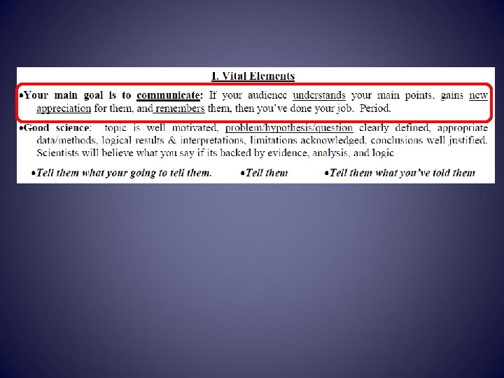 Giving a Great Science Talk I. Vital Elements I. Your purpose is to communicate, convince, and teach If your audience walks away understanding your main points, gains new appreciation for (or is convinced of) them, and remembers them, then you’ve done your job. Now here’s the main point II. The scientific format and theme you build brings your audience on a journey of scientific deduction and discovery I. Motivate, Introduce, Outline II. Strategy/Concepts III. Evidence/Points/Ideas IV. Your Conclusions