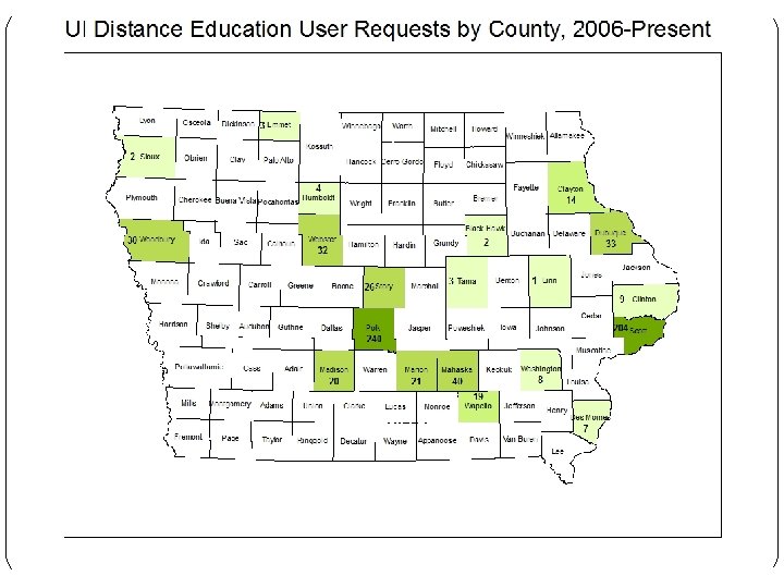 Distance Education at the UIOWA �Through the Center for Credit Programs/Distance Education Department �Largest program is Social Work, but also MBA, Nursing, undergraduate completion, others �Variety of formats �Remote locations �Online classes �Campus students taking online classes