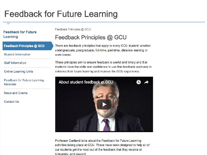 GCU Feedback Principles Feedback at GCU should be: • A dialogue • Supportive of future learning • Timely • Related to clear criteria • Accessible to all students • A continuous process • Available on all forms of assessment • Flexible and suited to students’ needs page 17 17