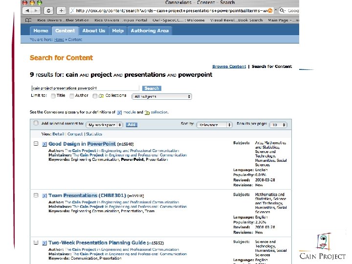 Cain Project Legacy Materials • 2008 is Cain Project’s 10 th and final year • Some staff hired for 2008 -2011 – Hewitt and Volz at Engineering – Purugganan and Eich part-time in Natural Sciences – Writing mentors and presentations coaches a possibility • Legacy materials to be available in three forms – Connexions http: //cnx. org – OWL-Space special “Communication Folder” – Web site repository