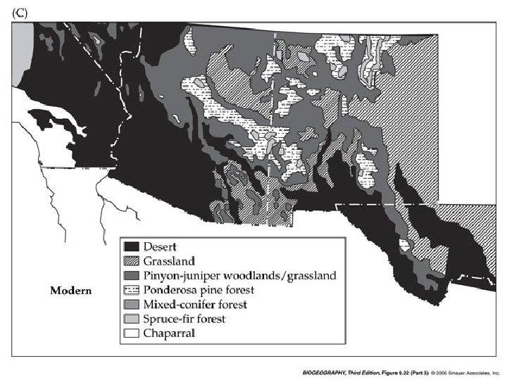 The next two slides show the distribution of vegetation zones in the southwestern United States during the last glacial period compared with those today. By moving back and forth between the two slides, you can see that desert regions have expanded greatly, while vegetation zones adapted to cooler climates have declined. Alpine habitat has disappeared, while the coniferous forests that were widespread during the glacial period have declined dramatically.
