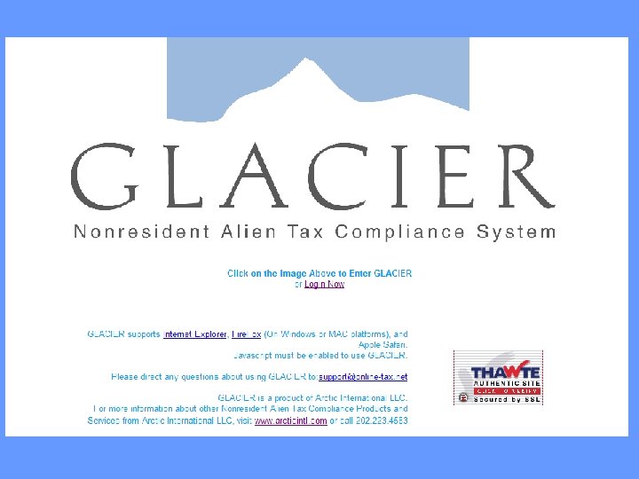 Who Is Required To Use GLACIER • Tax Compliance identifies students required to use GLACIER: -- Coded as International Student in UAccess -- Receive scholarship/stipend awards that exceed tuition and required fees • GLACIER administrator sends out an email through GLACIER to the student with login information