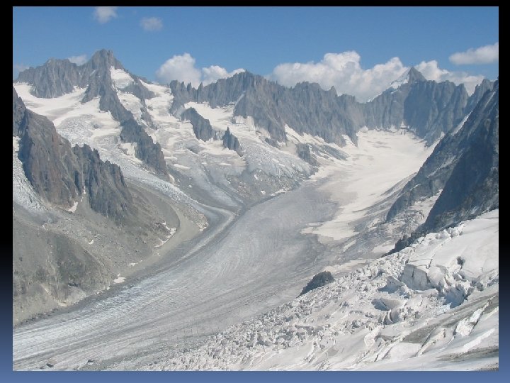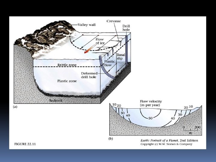 Alpine Glacier Flow Velocity Overall downward flow velocity ranges from a few millimeters to 15 meters per day Glaciers in warmer climate flow more quickly Central part moves faster than sides Surface moves faster than base Glacier movement Basal sliding Plastic flow Brittle/Rigid Zone