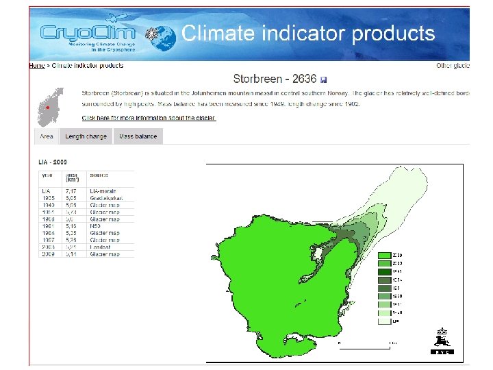 Cryo. Clim applications ■ Climate indicators ■ Glacier periodic photos ■ Glacier lake outburst floods http: //glacier. nve. no/viewer/CI/en/cc http: //glacier. nve. no/viewer/GPP/en/cc http: //glacier. nve. no/viewer/GLOF/en/cc