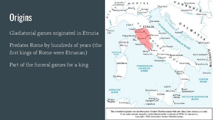 Origins Gladiatorial games originated in Etruria Predates Rome by hundreds of years (the first kings of Rome were Etruscan) Part of the funeral games for a king