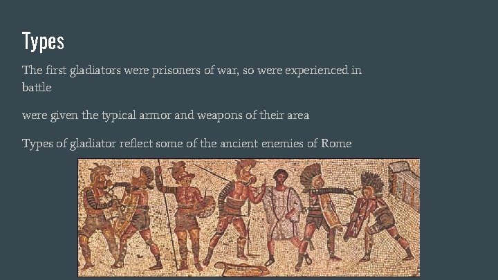 Types The first gladiators were prisoners of war, so were experienced in battle were given the typical armor and weapons of their area Types of gladiator reflect some of the ancient enemies of Rome