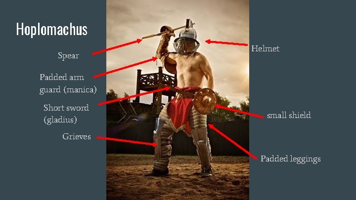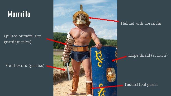 Murmillo Helmet with dorsal fin Quilted or metal arm guard (manica) Large shield (scutum) Short sword (gladius) Padded foot guard