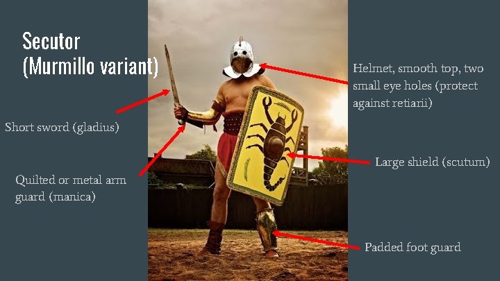 Secutor (Murmillo variant) Helmet, smooth top, two small eye holes (protect against retiarii) Short sword (gladius) Large shield (scutum) Quilted or metal arm guard (manica) Padded foot guard