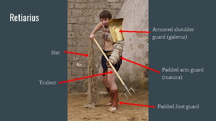 Retiarius Armored shoulder guard (galerus) Net Trident Padded arm guard (manica) Padded foot guard