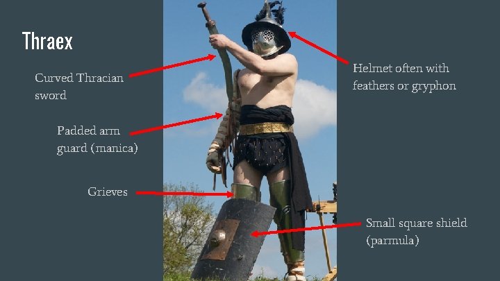 Thraex Curved Thracian sword Helmet often with feathers or gryphon Padded arm guard (manica) Grieves Small square shield (parmula)