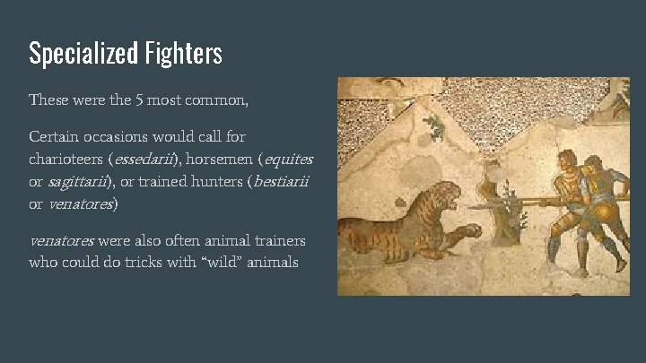 Specialized Fighters These were the 5 most common, Certain occasions would call for charioteers (essedarii), horsemen (equites or sagittarii), or trained hunters (bestiarii or venatores) venatores were also often animal trainers who could do tricks with “wild” animals