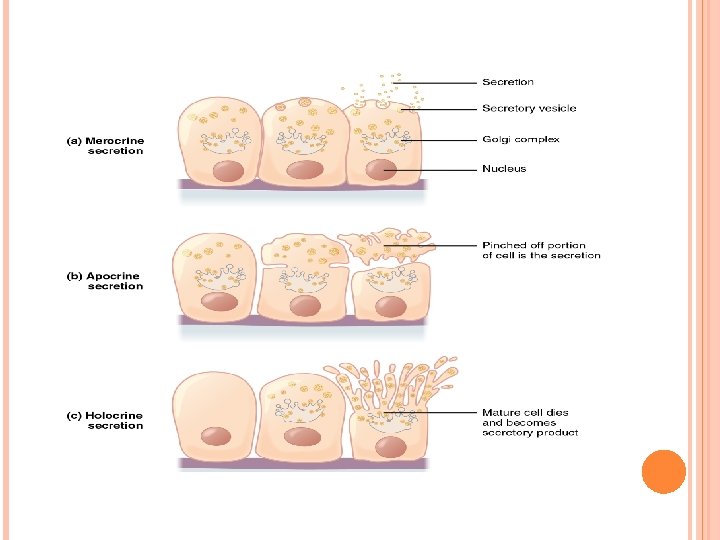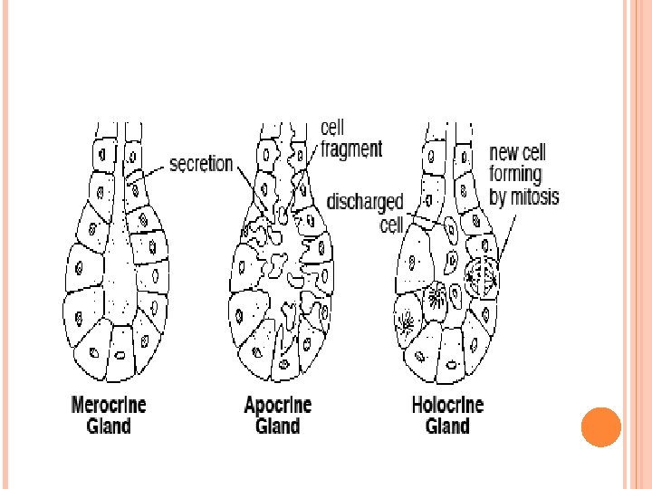 v Holocrine secretion : whole cell is excreted with secretion by apoptosis both secretory products & cell debris are discharged into the lumen of gland e. g sebaceous gland tarsal gland