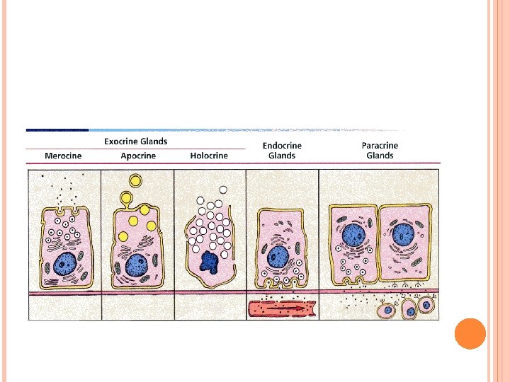 Based on mode of secretion : v Merocrine : the secretory product is delivered in membrane bound vesicle to apical surface of cell extrude their content by exocytosis e. g. pancreatic acinar cell o