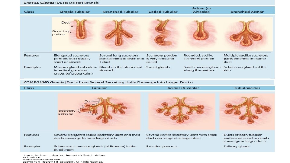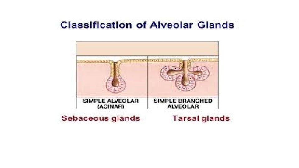 Alveolar glands: have alveolar (flask shaped) or acinar (grape like) secretory parts Branched alveolar glands are classified as follows: