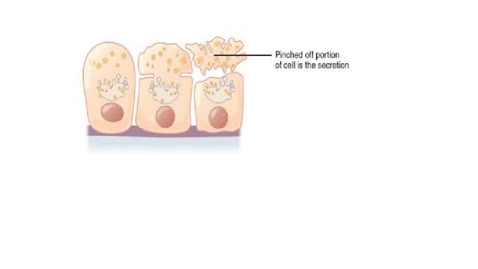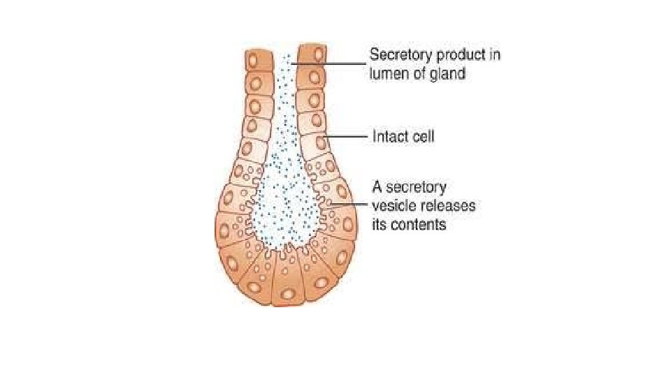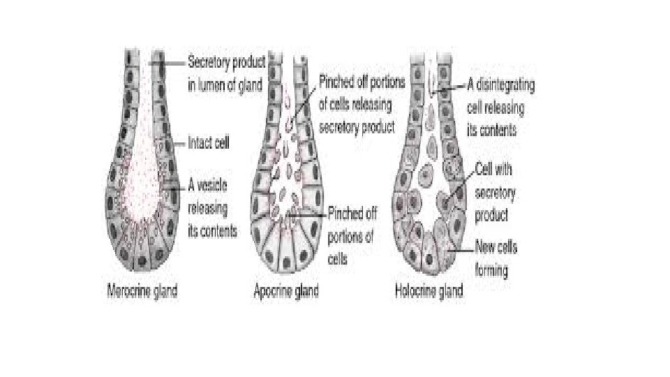 III- According to method (mode) of secretion: 1 -Exocrine glands have ducts - and they secrete onto a surface: examples of exocrine glands are: sebaceous and sweat glands (in the skin), salivary glands (oral), Brunner's glands. So, we have covered their basic structure and function in tissue types, and we have looked at several examples of exocrine glands in other topics. Exocrine glands can be Unicellular - Goblet cells, or Multicellular - and the basis of their classification was covered in the topic on epithelia. Exocrine can be classify depended of the way that secretion is :