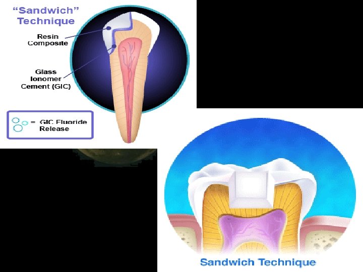 SANDWICH TECHNIQUE GIC is sandwiched between tooth and composite resin. Used in case of deep carious lesion. ADVANTAGE Etching avoided in deep caries- avoid pulpal irritation. Better strength is achieved. Prevent recurrent caries due to F ion release. Chemical bonding to tooth achieved by GIC.
