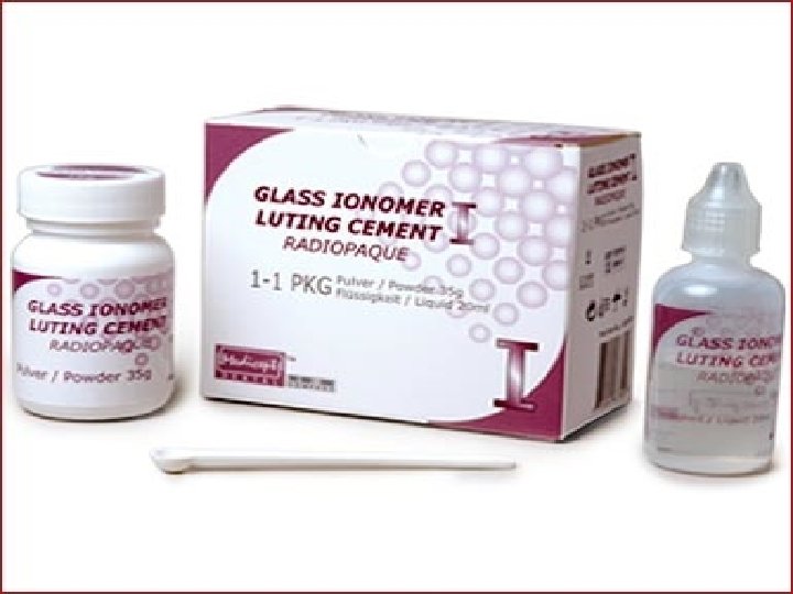 Luting Agents Excellent for permanent cementation of crowns, bridges. Releases fluoride reduces sensitivity by giving a firm foundation for composites. Fast setting - low film thickness & low viscosity. P/Lratio………… 1. 5: 1 Typical Physical Properties: Mixing Time: 15 seconds Setting Time: 2 minutes Working Time: 2 minutes