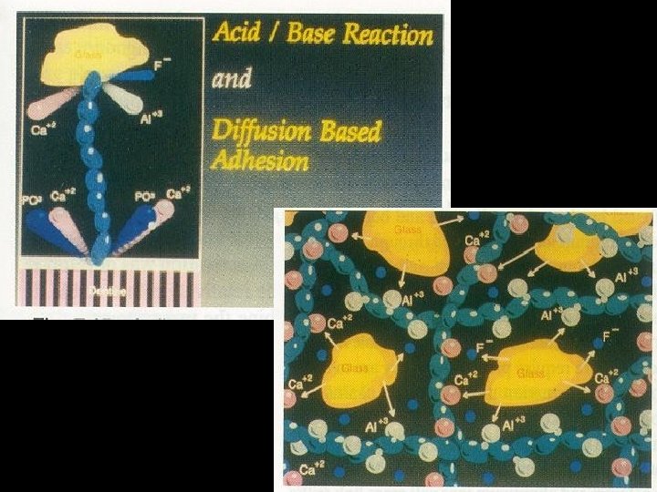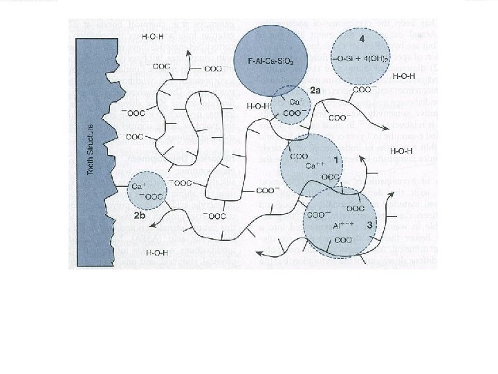 Powder and liquid mixed together Acid attacks the glass particles. Na, Ca, Al , F ions are leached into the aquous solution Ca poly salts in the beginning and later Al – poly salts. Two salts cross links to form polyanionic chain.
