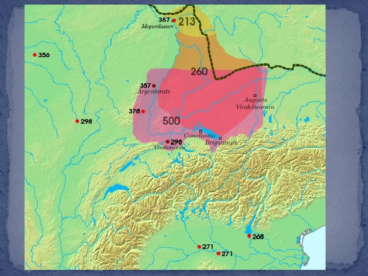 Caracalla e gli Alamanni � 3 secolo incominciarono ad attaccare i settori vulnerabili della frontiera romana �Alamanni avevano chiesto aiuto a Caracalla, che peró li sfruttó per conquistare il loro territorio (213) �Caracalla si ammaló �Alamanni avevano dato a Caracalla una maledizione �Caracalla si diede il nome „ Alamannicus“, perché riuscí a sconfiggere gli Alamanni. �Infatti pure la regione fu chiamata Alamannia