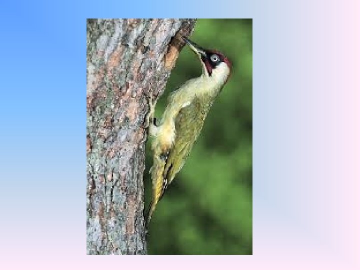 ALIMENTAZIONE • Il picchio verde si nutre prevalentemente di insetti e larve celate sotto la corteccia dei tronchi d'albero, che cattura grazie all’aiuto del suo becco, appositamente utilizzato perforare il legno.