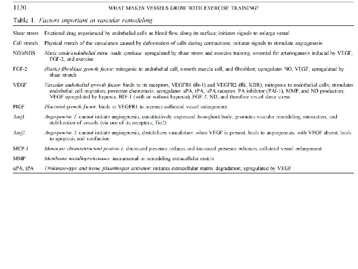 Questo lavoro considera le modificazioni strutturali indotte dall’allenamento sul sistema vascolare e i relativi meccanismi. È importante distinguere i diversi segmenti vascolari. L’aumento di diametro di vasi esistenti (arteriogenesi) è un mezzo efficace per aumentare il flusso, mentre l’espansione della rete capillare (angiogenesi) migliora gli scambi fra il sangue e i tessuti. I principale fattori sono elencati nella tabella.