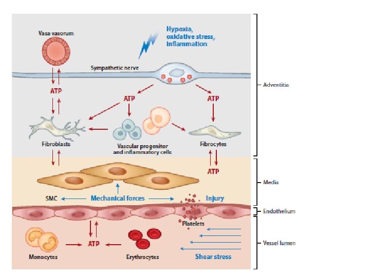 PURINE EXTRACELLULARI: MEDIATORI ENDOGENI NELL’AVVENTIZIA. Le purine e pirimidine (ATP, ADP, AMP, adenosina, UTP e UDP) sono le più diffuse fra i numerosi fattori che controllano il rimodellamento vascolare: la loro concentrazione aumenta nel micorambiente tessutale locale di varie forme fisiologiche e patologiche come l’ipossia, l’infiammazione, la forza di taglio del flusso, forze meccaniche, shock osmotico, trombosi e stimolazione simpatica. SPECIE REATTIVE DELL’OSSIGENO NELL’AVVENTIZIA. Anche i ROS generati nell’avventizia delle arterie polmonari contribuiscono agli effetti da fuori a dentro nella vasocostrizione polmonare e nel rimodellamento. Gli AFs attivati producono ROS soprattutto per la via NADPH ossidasi, ma ci sono anche altre fonti di ROS: i mitocondri, il disaccoppiamento dell’e. NOS e la xantina ossidasi. I ROS promuovono il reclutamento di cellule infiammatorie, ulteriore fonte di ROS. Queste diverse sorgenti di ROS producono ossidanti in diversi compartimenti cellulari che determinano lo stato redox locale e i bersagli specifici dei ROS. L’AVVENTIZIA: DEPOSITO DI CELLULE PROGENITORI VASCOLARI. Lo strato avventiziale dei vasi in sviluppo e nell’adulto funziona come una nicchia per cellule staminali e progenitori di cellule endoteliali e mesenchimali, muscolo liscio e periciti.