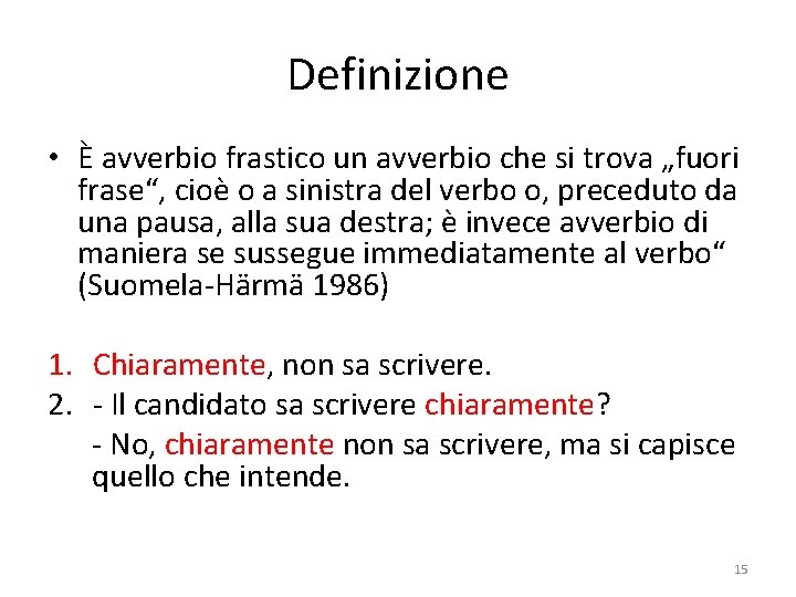 Definizione • È avverbio frastico un avverbio che si trova „fuori frase“, cioè o a sinistra del verbo o, preceduto da una pausa, alla sua destra; è invece avverbio di maniera se sussegue immediatamente al verbo“ (Suomela-Härmä 1986) 1. Chiaramente, non sa scrivere. 2. - Il candidato sa scrivere chiaramente? - No, chiaramente non sa scrivere, ma si capisce quello che intende. 15