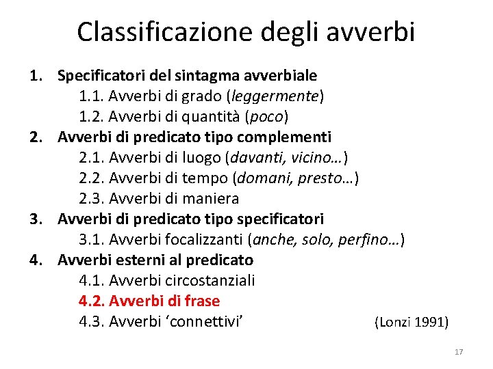 Avverbi di frase (Lonzi 1991) 1. avverbi modali (chiaramente, presumibilmente) 2. avverbi valutativi (fortunatamente, purtroppo) 3. avverbi di evento (improvvisamente, inaspettatamente) 4. avverbi di inquadramento (solitamente, ufficialmente) 5. avverbi di atto linguistico (francamente, personalmente) 6. avverbi di soggetto (generosamente, intelligentemente)