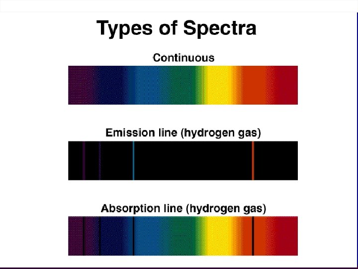 • Spettri di assorbimento: • se un gas o una sostanza resa gassosa che si trova a temperatura inferiore a quella di una sorgente di luce bianca, è interposto tra detta sorgente ed uno spettroscopio si ottiene uno spettro di assorbimento; esso è caratterizzato da uno sfondo colorato continuo e dalle righe di assorbimento. Per una stessa sostanza le righe di assorbimento sono sovrapponibili, ovvero hanno la stessa lunghezza d'onda delle righe colorate dello spettro di emissione.