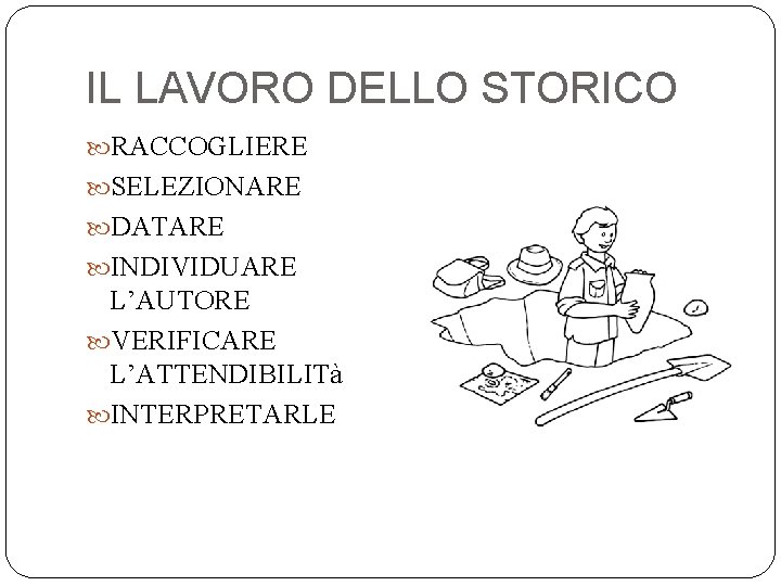 IL LAVORO DELLO STORICO RACCOGLIERE SELEZIONARE DATARE INDIVIDUARE L’AUTORE VERIFICARE L’ATTENDIBILITà INTERPRETARLE