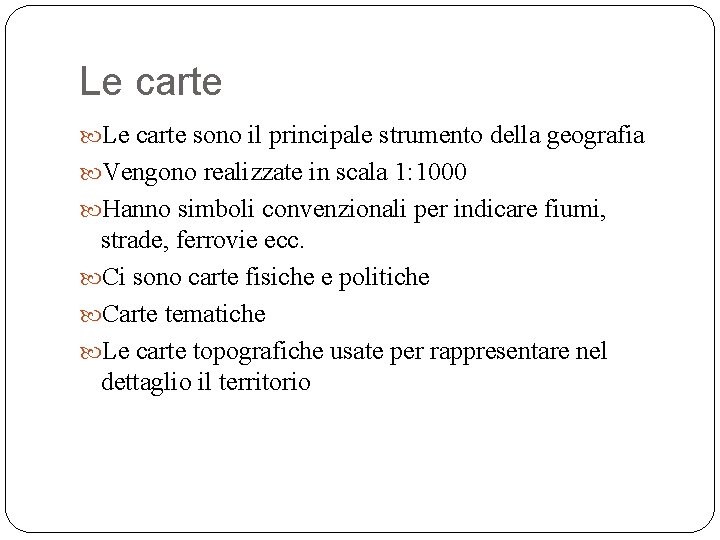 Le carte sono il principale strumento della geografia Vengono realizzate in scala 1: 1000 Hanno simboli convenzionali per indicare fiumi, strade, ferrovie ecc. Ci sono carte fisiche e politiche Carte tematiche Le carte topografiche usate per rappresentare nel dettaglio il territorio