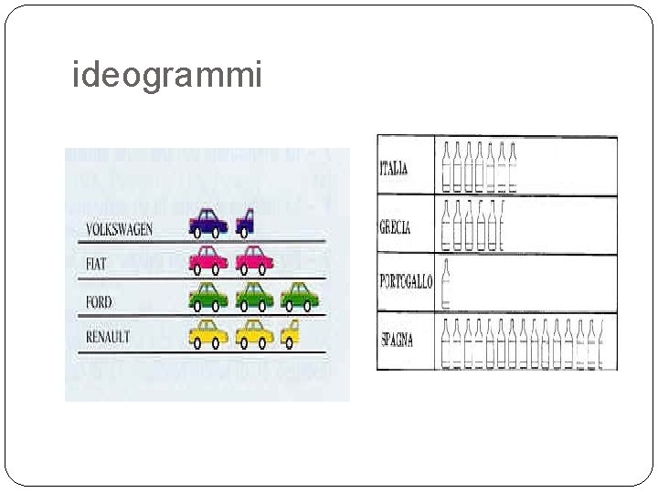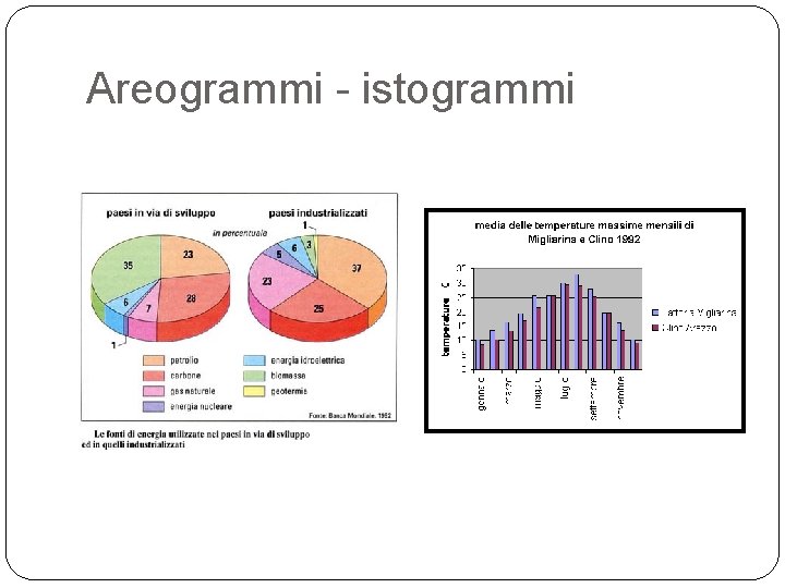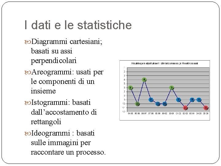 I dati e le statistiche Diagrammi cartesiani; basati su assi perpendicolari Areogrammi: usati per le componenti di un insieme Istogrammi: basati dall’accostamento di rettangoli Ideogrammi : basati sulle immagini per raccontare un processo.