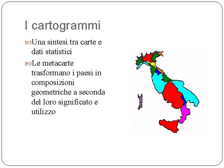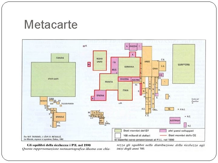 I cartogrammi Una sintesi tra carte e dati statistici Le metacarte trasformano i paesi in composizioni geometriche a seconda del loro significato e utilizzo