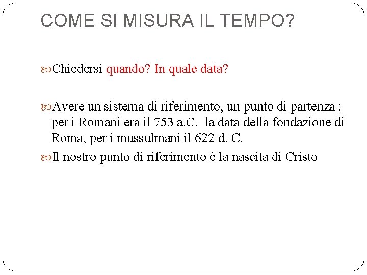 COME SI MISURA IL TEMPO? Chiedersi quando? In quale data? Avere un sistema di riferimento, un punto di partenza : per i Romani era il 753 a. C. la data della fondazione di Roma, per i mussulmani il 622 d. C. Il nostro punto di riferimento è la nascita di Cristo