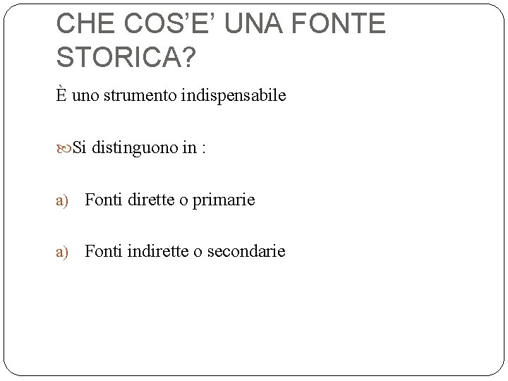 CHE COS’E’ UNA FONTE STORICA? È uno strumento indispensabile Si distinguono in : a) Fonti dirette o primarie a) Fonti indirette o secondarie