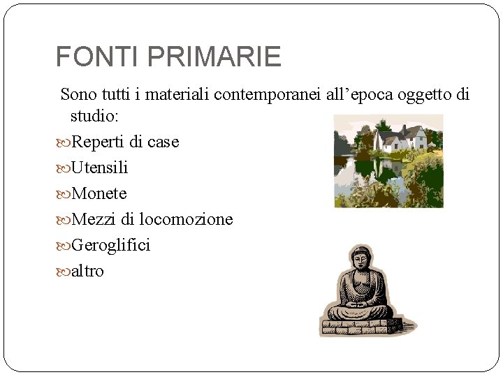 FONTI PRIMARIE Sono tutti i materiali contemporanei all’epoca oggetto di studio: Reperti di case Utensili Monete Mezzi di locomozione Geroglifici altro