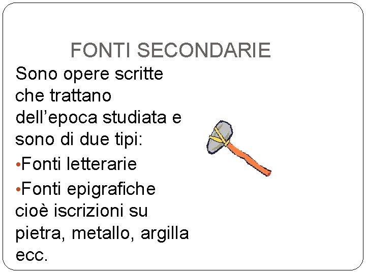 FONTI SECONDARIE Sono opere scritte che trattano dell’epoca studiata e sono di due tipi: • Fonti letterarie • Fonti epigrafiche cioè iscrizioni su pietra, metallo, argilla ecc.