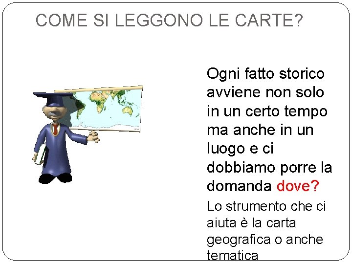 COME SI LEGGONO LE CARTE? Ogni fatto storico avviene non solo in un certo tempo ma anche in un luogo e ci dobbiamo porre la domanda dove? Lo strumento che ci aiuta è la carta geografica o anche tematica