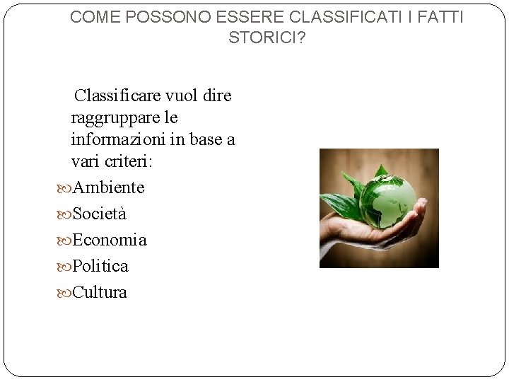 COME POSSONO ESSERE CLASSIFICATI I FATTI STORICI? Classificare vuol dire raggruppare le informazioni in base a vari criteri: Ambiente Società Economia Politica Cultura
