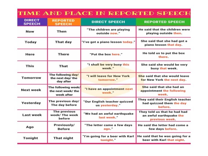 Narration/ Reported Speech There are two ways of reporting what a person has said : direct and indirect. Direct Speech • In direct speech, we repeat the original speaker’s exact words, e. g. He said, “I have lost my books”. Remarks thus repeated are placed between inverted commas and a comma is placed immediately before the remark. Direct speech is found in conversations in books, in plays and in quotations. Indirect Speech • In indirect speech, we give the exact meaning of a remark or a speech, without necessarily using the speaker’s exact words. e. g. He said (that) he had lost his books. There is no comma after say in indirect speech. That can usually be omitted after say and tell + object.