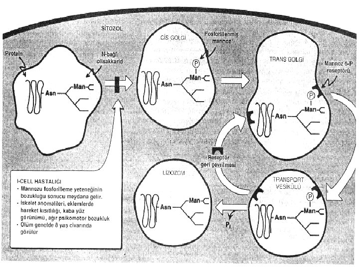 I-Cell hastalığı: • Mannozu fosforilleme yeteneği bozulmuştur. • İskelet anomalileri, eklemlerde hareket kısıtlılığı, kaba yüz görünümü ve ağır psikomotor bozukluk oluşur. • Genelde 8 yaş civarında ölüm oluşur. • I-hücre hastalarından elde edilen hücre kültürleri normal lizozomal enzimlerin hemen tümünden eksik bulunmuştur. Hastaların serum örneklerinde ise bu lizozomal enzimlerin çok yüksek düzeylerde bulunduğu saptanmıştır. Yani lizozomal enzimler sentezlenmekte fakat lizozom içine verilememekte, dolaşıma salınmaktadır. • yalancı Hurler polidistrofisi I-hücre hastalığı ile yakından ilişkilidir fakat hastalığın seyri hafifdir ve hastalar genelde erişkin yaşa kadar ulaşırlar.