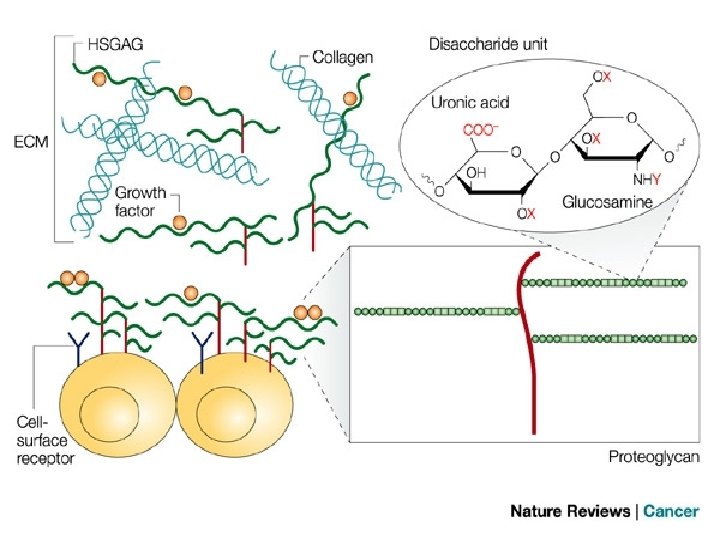 • GAG’lar uzun, çoğunlukla dallanmamış ve genellikle tekrarlayan disakkarit birimlerinden (asit şeker-amino şeker) oluşmuş heteropolisakkarid zincirleridir. • Amino şekerler genellikle pozitif yükü kaldırılmış D-glukozamin veya D-galaktozamindir. • Asit şekerler genellikle D-glukronik asit ve L-iduronik asittir. • Tek istisna asidik şeker yerine galaktoz içeren keratindir.
