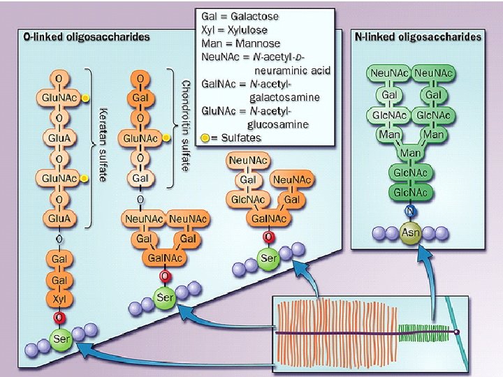 • O glikozid bağları genel olarak membranda bulunan proteinler, müsinler, proteoglikanlar, kollajenler, nükleer proteinler ve sitozolik proteinlerde yer alır. • N-glikozid bağı içeren oligo sakkaridler, kompleks oligosakkaridler (ki bunlar ayrıca N-asetilglukozamin, L-fukoz, NANA gibi şekerler içerebilir) ve çok mannoz içerikli oligosakkaridler olarak ikiye ayrılır.