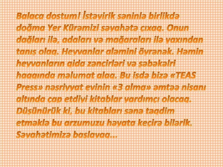 Dünyanın atlası : dünyanı bükülən yeddi xəritə vasitəsilə kəşf et. – Kitab səni Yer kürəsinin bütün cəhətlərinə, qitələrinə səyahətə aparacaq. Çox maraqlıdır!!! Sən burada bütün qitələrin xalqları, onların mədəniyyəti, yaşam tərzi, coğrafi mövqeyi və heyvanlar aləmilə tanış olacaqsan.