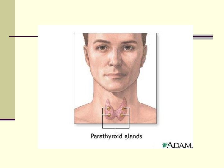 PARATIROIDES n PARATHORMONA: a) Estimula la liberación de calcio desde los huesos, b) Induce la absorción intestinal del calcio, c) Promueve la reabsorción renal de calcio, d) Afecta a la homeostasis de fosfatos.