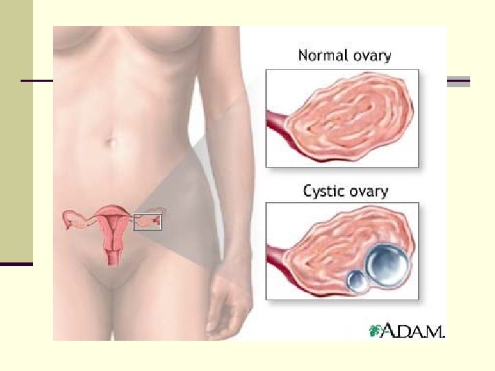OVARIOS n Sintetizan las hormonas sexuales femeninas: estrógenos (células foliculares) y progesterona (cuerpo lúteo o amarillo). n Los estrógenos estimulan el desarrollo de las glándulas mamarias y los órganos genitales femeninos, redistribuyen el tejido adiposo modelando la figura femenina, entre otras características sexuales secundarias de la mujer. n La progesterona estimula el desarrollo del endometrio uterino, facilitando la implantación del embrión. n Ambas participan en la regulación del ciclo menstrual.